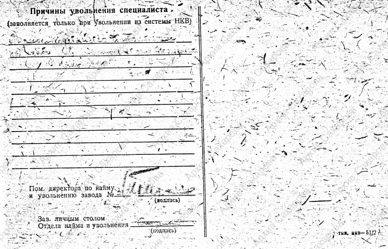 6) на незаполненном обороте бланка неразборчивая подпись Пом. директора по найму и увольнению завода №3