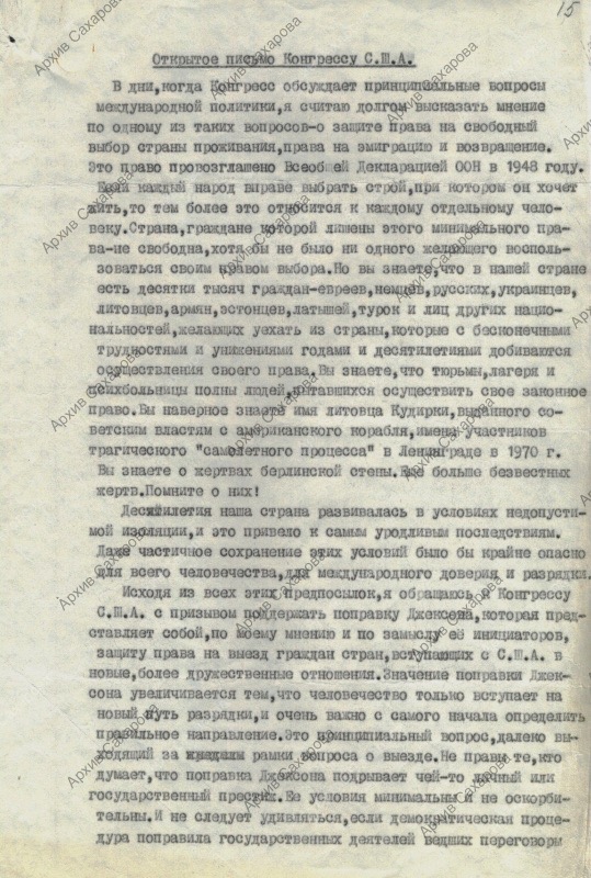 "Открытое письмо Конгрессу США" с призывом поддержать поправку Джексона