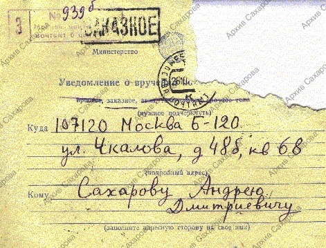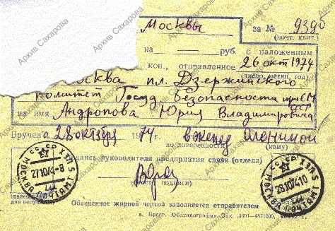 Уведомление о вручении письма, отправленного Сахаровым 26 октября 1974 г. на имя Ю.В.Андропова