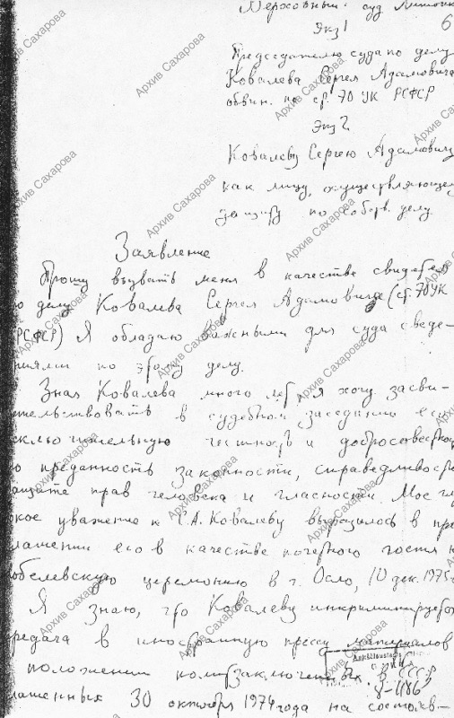 "Заявление" в Верховный суд Литовской ССР (копия Ковалеву) с просьбой вызвать в качестве свидетеля по делу С.А.Ковалева