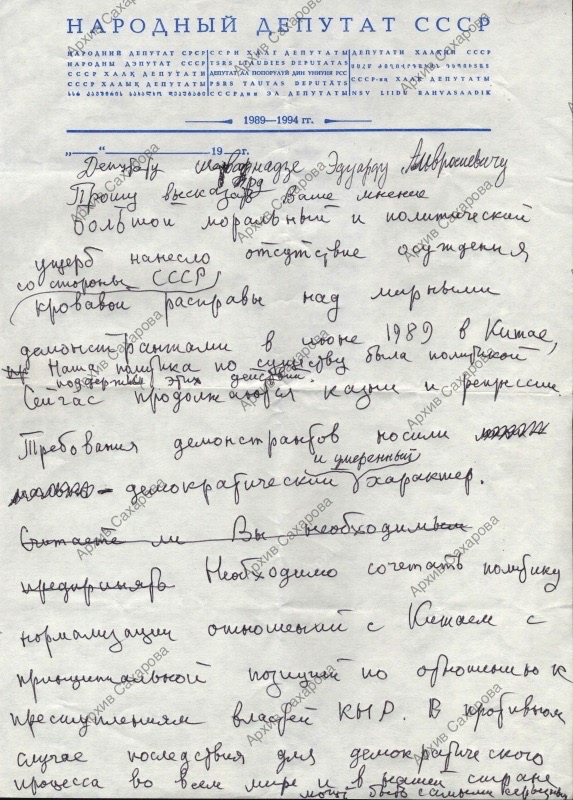 Записка "депутату Шеварднадзе Эдуарду Амвросиевичу" о необходимости осуждения разгона мирной демонстрации в Китае