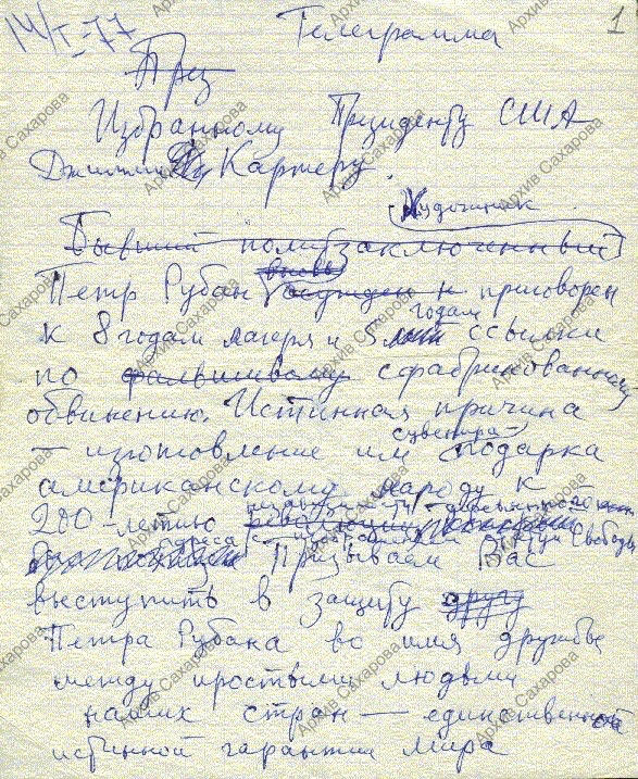 "Телеграмма. Избранному президенту США Джимми Картеру" с призывом выступить в защиту осужденного по сфабрикованному обвинению Петра Рубана