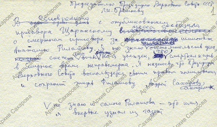 Обращение к Председателю Президиума Верховного Совета СССР Л.И.Брежневу о помиловании приговоренного к смертной казни Анатолия Филатова, осужденного одновременно с А.Б.Щаранским