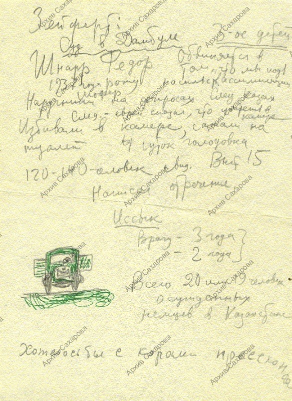 Записка с информацией о суде в Джамбуле, о следствии Ф.Шнарра, о немцах в Казахстане
