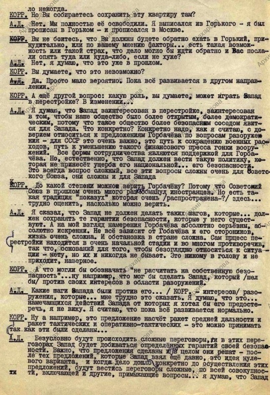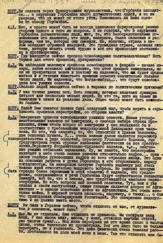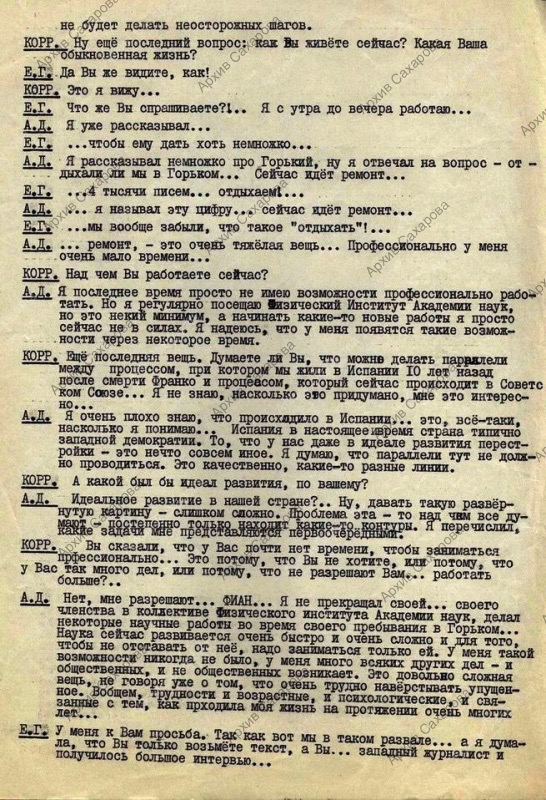 Интервью корреспондентке испанской газеты "El Pais" Pilar Bonet об освобождении политзаключенных, о жизни после возвращения из Горького и др.
