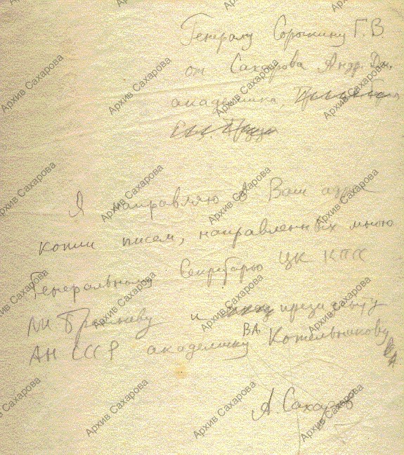Письмо генералу Г.В.Сорочкину о направлении ему копий писем на имя Л.И.Брежнева и президента АН СССР В.А.Котельникова