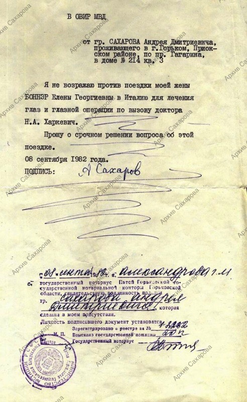 Нотариально заверенное обращение А.Д. Сахарова в ОВИР МВД по поводу поездки жены Е.Г. Боннэр в Италию для лечения глаз