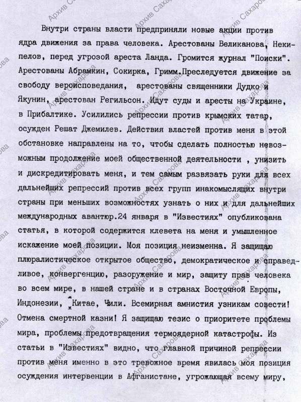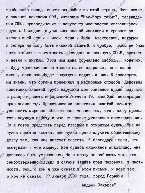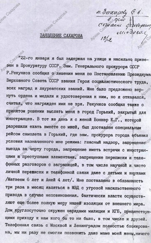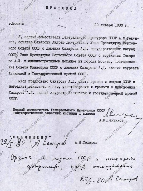 "Заявление Сахарова". "Протокол" от 22 января 1980 г. об объявлении репрессивных мер к А.Д. Сахарову и отказом А.Д. Сахарова сдать гос. награды