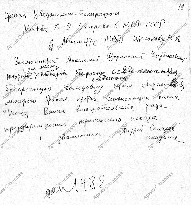 Срочная телеграмма министру МВД СССР Н.А.Щелокову в защиту заключенного Анатолия Щаранского, проводящего голодовку в Чистопольской тюрьме