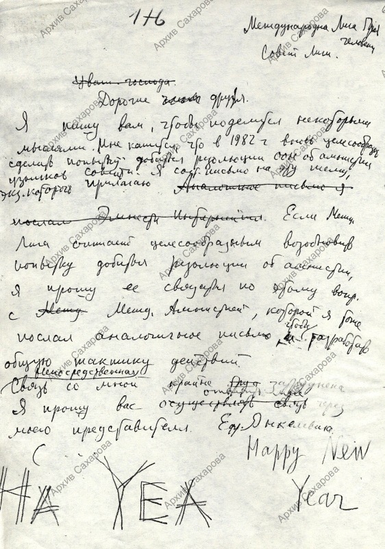Письмо в Международную Лигу прав человека с предложением добиваться в 1982 г. резолюции ООН о всемирной амнистии узников совести, посланное с обращением на эту тему