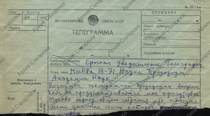 на бланке для телеграмм; текст на обороте написан рукой Е.Г.Боннэр