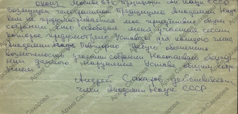Два черновика ответной телеграммы в Президиум АН СССР в связи с отказом прислать приглашение для участия в Общем собрании Академии наук