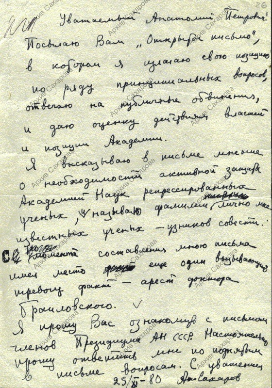 Письмо президенту АН СССР А.П. Александрову с извещением об отправке "Открытого письма"