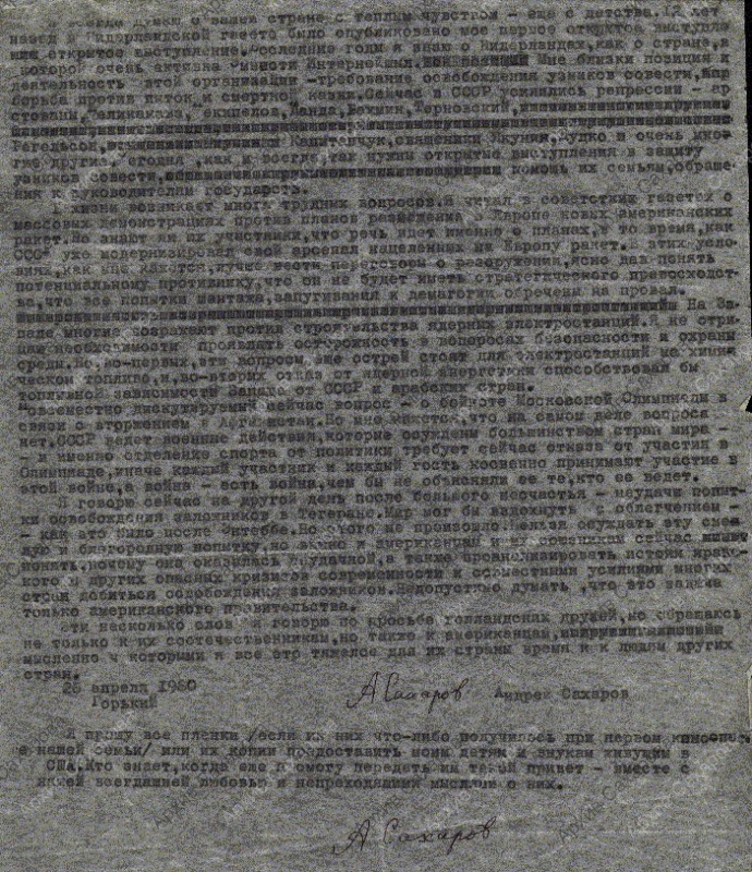 Обращение к голландским и американским друзьям о деятельности Эмнисти Интернейшнл, необходимости открытых выступлений в защиту узников совести, переговоров о разоружении, о строительстве ядерных электростанций, о бойкоте Московской Олимпиады в связи с вторжением в Афганистан и др. проблемах