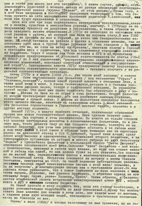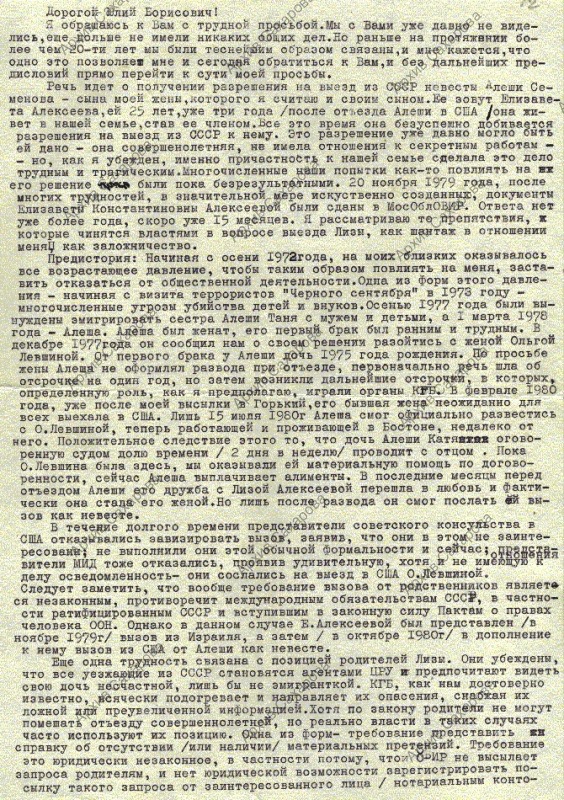 Письмо Ю.Б.Харитону с подробным изложением обстоятельств дела Лизы Алексеевой, просьбой способствовать решению ее проблемы и защитить от шантажа