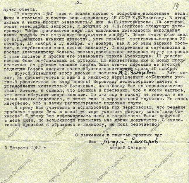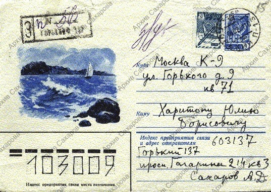 1) почтовый конверт, подписанный А.Д.Сахаровым от руки - 1л.;