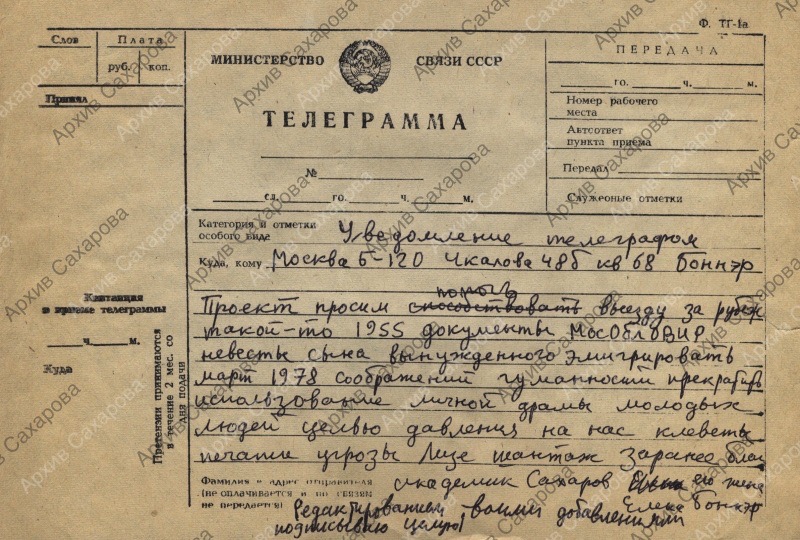 2) телеграмма была отправлена в Москву на имя Е.Г.Боннэр, адресат определен по второму черновому варианту;