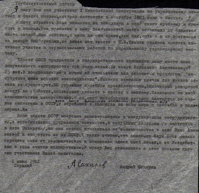 Письмо к зарубежному участнику 10-й Европейской конференции по управляемому синтезу и физике плазмы в Москве с информацией о деле Лизы Алексеевой и просьбой к коллегам о поддержке