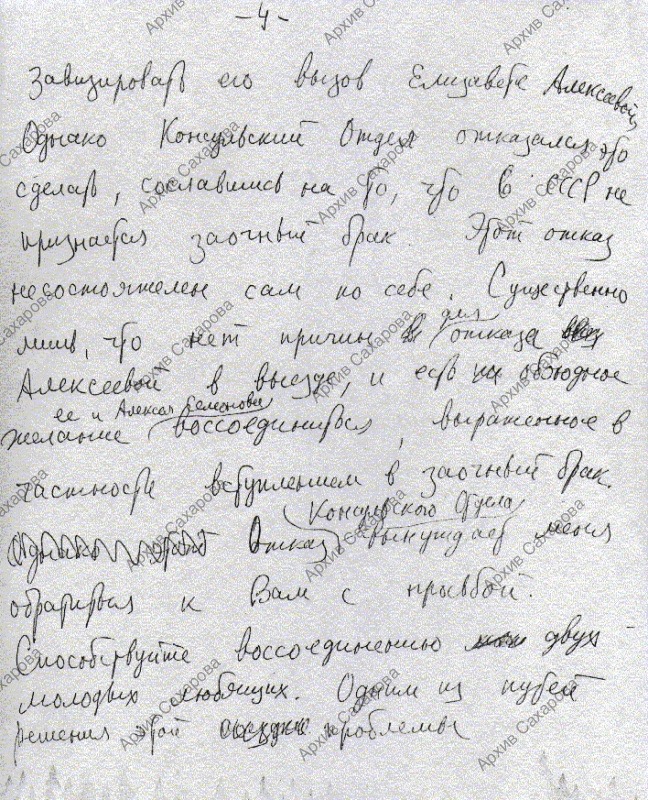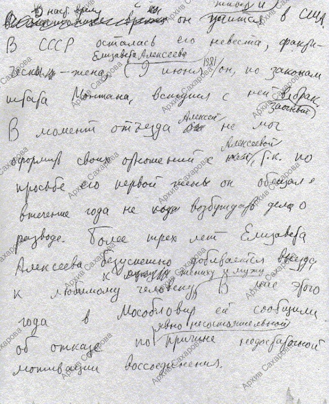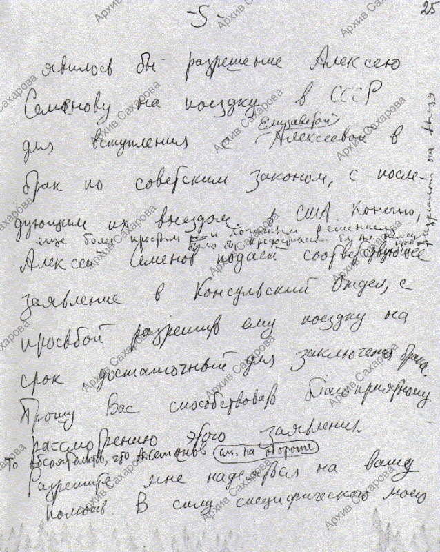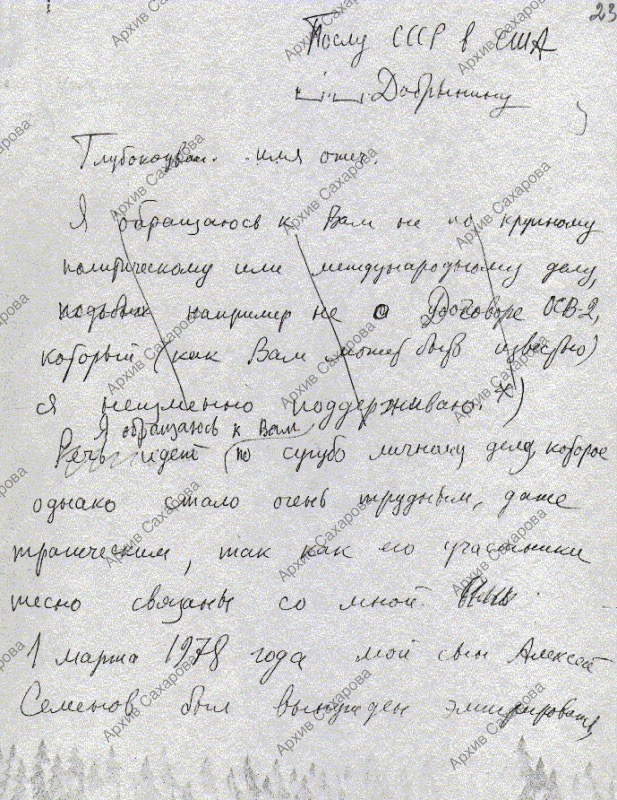 Письмо послу СССР в США Добрынину с подробным изложением дела Лизы Алексеевой и просьбой способствовать приезду Алексея Семенова в СССР для заключения брака с Лизой Алексеевой по советским законам