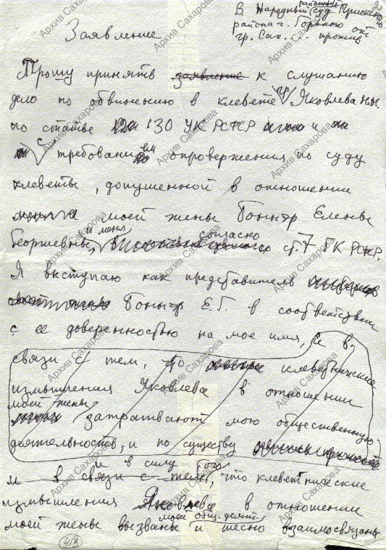 "Заявление" (В народный суд Приокского района г. Горького с просьбой принять к слушанию дело по обвинению в клевете гр. Яковлева Н.Н.)