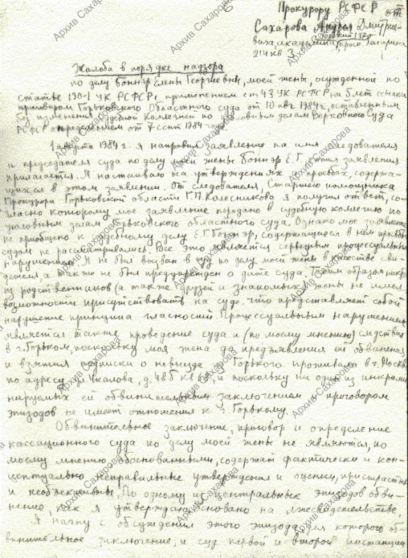 Жалоба на имя прокурора РСФСР с обоснованием требования отмены приговора Е.Г. Боннэр