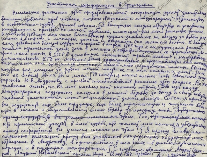 документ был найден в бумагах М.Л.Левина его вдовой Н.М.Леонтович и передан в Архив Сахарова