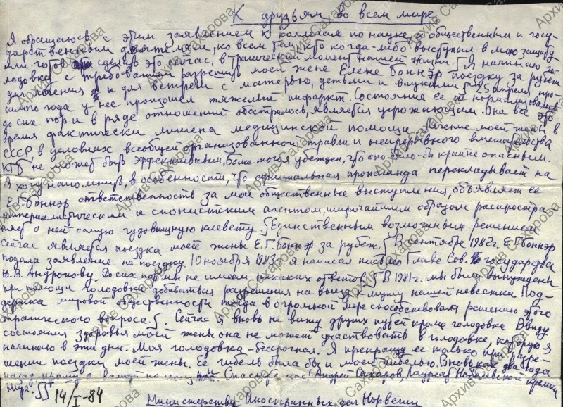 в подлиннике (АРС00468) - на одном листе с двумя другими документами (один написан рукой Сахарова, другой - Е.Г.Боннэр)