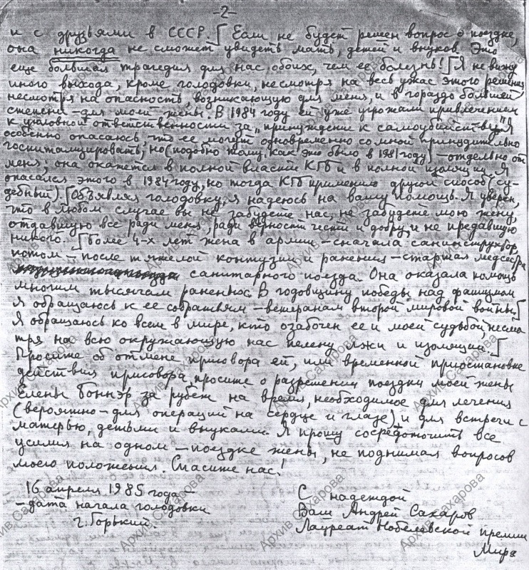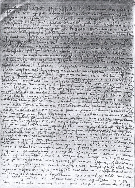 Обращение к друзьям с сообщением о возобновлении с 16 апреля 1985 г. голодовки с требованием предоставить Е.Г. Боннэр право поездки за рубеж для лечения и встречи с родными и надеждой на помощь друзей