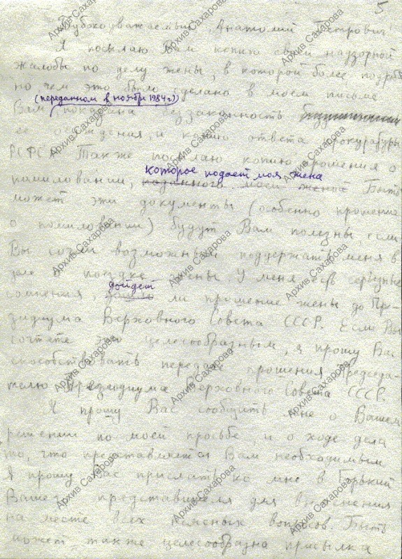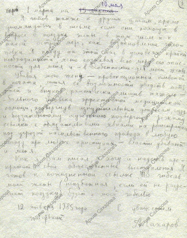 Письмо с сообщением об отправке надзорной жалобы по делу Е.Г. Боннэр, подтверждением своего решения о выходе из Академии наук и готовности возобновить голодовку при отсутствии разрешения поездки жены за рубеж для лечения