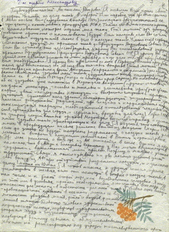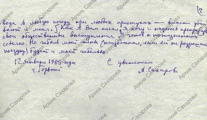 Письмо с сообщением об отправке надзорной жалобы по делу Е.Г. Боннэр, подтверждением своего решения о выходе из Академии наук и готовности возобновить голодовку при отсутствии разрешения поездки жены для лечения