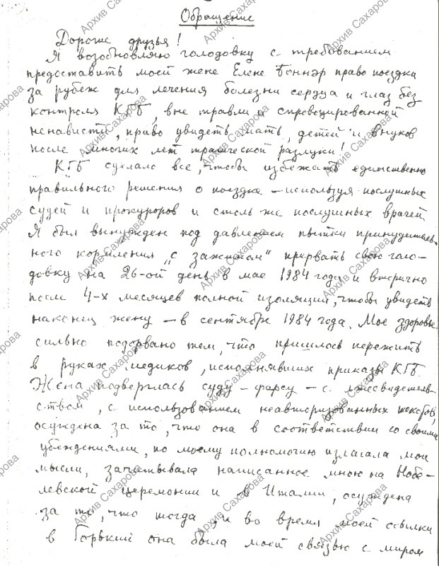 Обращение к друзьям с сообщением о возобновлении с 26 марта 1985 г. голодовки с требованием предоставить Е.Г. Боннэр право поездки за рубеж для лечения и встречи с родными, обоснованием принятого решения и надеждой на помощь друзей