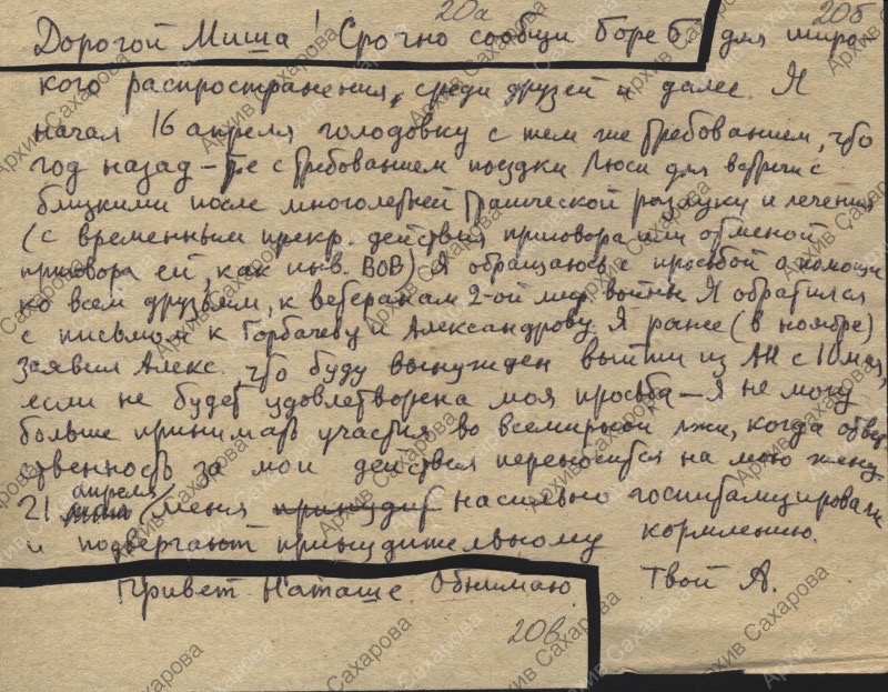 Письмо М.Л.Левину "для широкого распространения" о начатой 16 апр. 1985 г. голодовке и о насильственной госпитализации