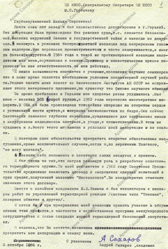 "ЦК КПСС. Генеральному Секретарю ЦК КПСС М.С. Горбачеву" (просьба прекратить его незаконную депортацию в Горький с обязательством прекратить открытые выступления)