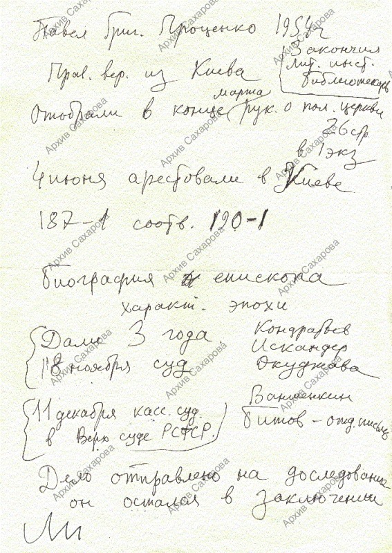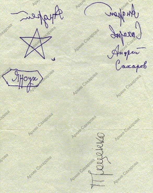 черной ручкой, на обороте есть рисунок и росписи А.Сахарова синей ручкой; фамилия ("Проценко") написана Еленой Боннэр черной ручкой