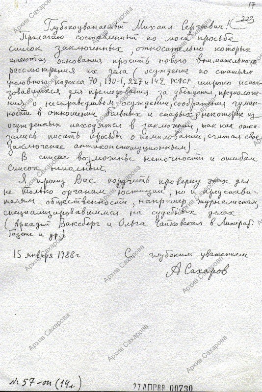 "Глубокоуважаемый Михаил Сергеевич!" (Обращение к М.С. Горбачеву о новом рассмотрении дел узников совести)