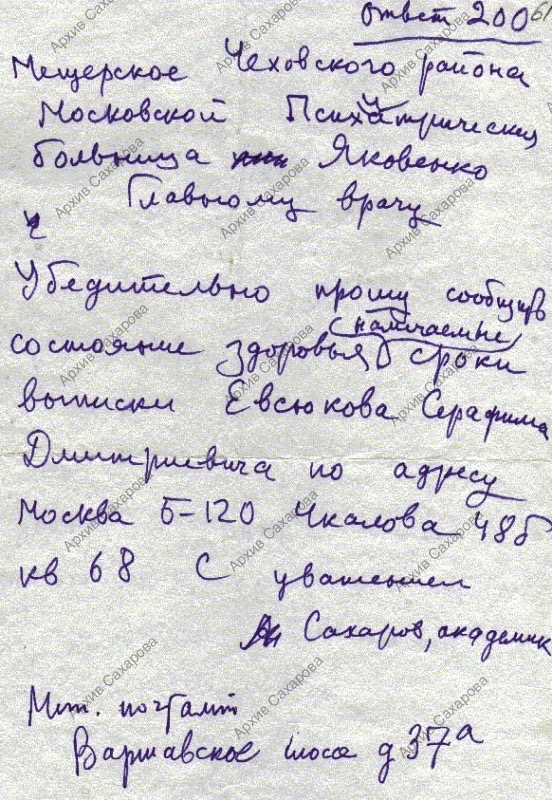 Телеграмма главному врачу психиатрической больницы им.Яковенко о состоянии здоровья и сроке выписки С.Д.Евсюкова