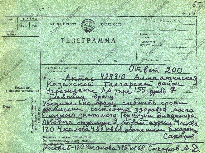 Телеграмма главному врачу СПБ в г. Актасе Казахской ССР с просьбой сообщить о состоянии здоровья и сроках комиссии Владимира Гершуни