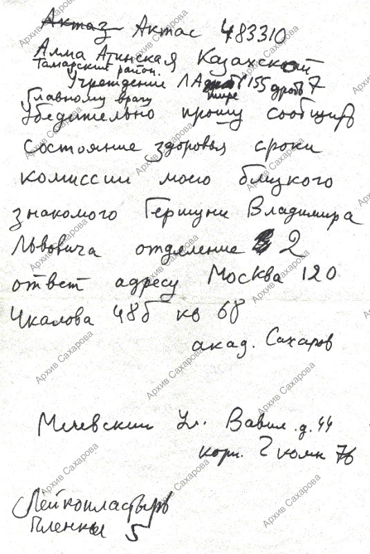 Телеграмма главному врачу СПБ в г. Актасе Казахской ССР с просьбой сообщить о состоянии здоровья и сроках комиссии Владимира Гершуни