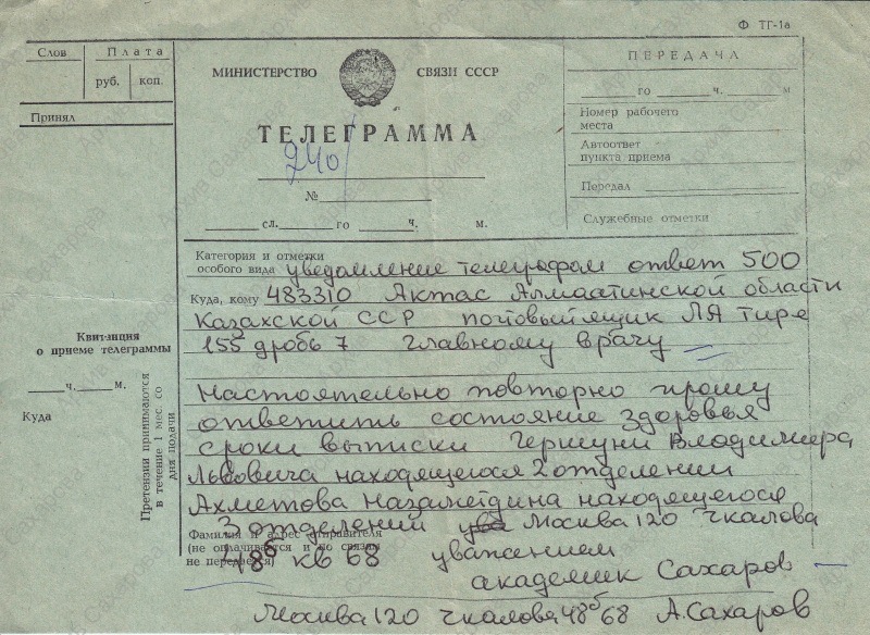 Повторная телеграмма главному врачу СПБ в г. Актасе Казахской ССР с просьбой сообщить о состоянии здоровья и сроках комиссии В.Гершуни и Н.Ахметова