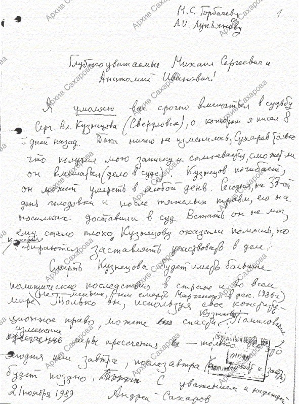 "М.С. Горбачеву. А.И. Лукьянову" (Обращение по делу подсудимого С.В. Кузнецова)