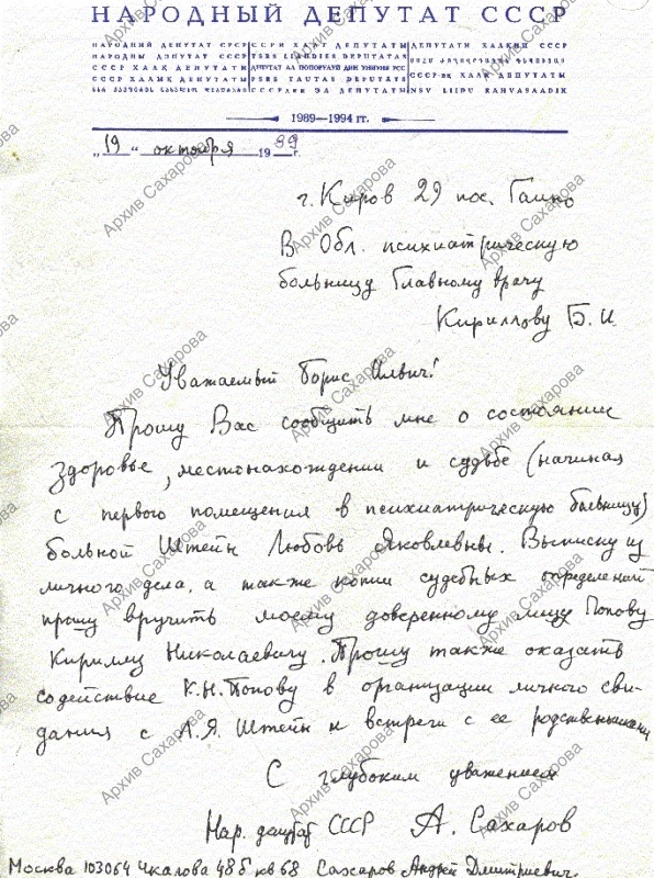 "г. Киров 29, пос. Гаино. В Обл. психиатрическую больницу. Главному врачу Кириллову Б.И." (Депутатский запрос о больной Л.Я. Штейн)