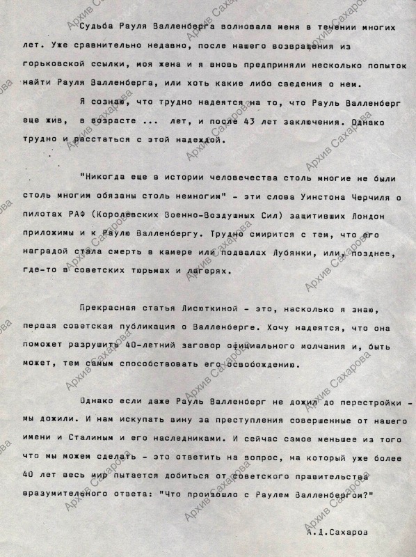Заметка о судьбе Рауля Валленберга с упоминанием первой советской публикации о нем Л.Лисюткиной