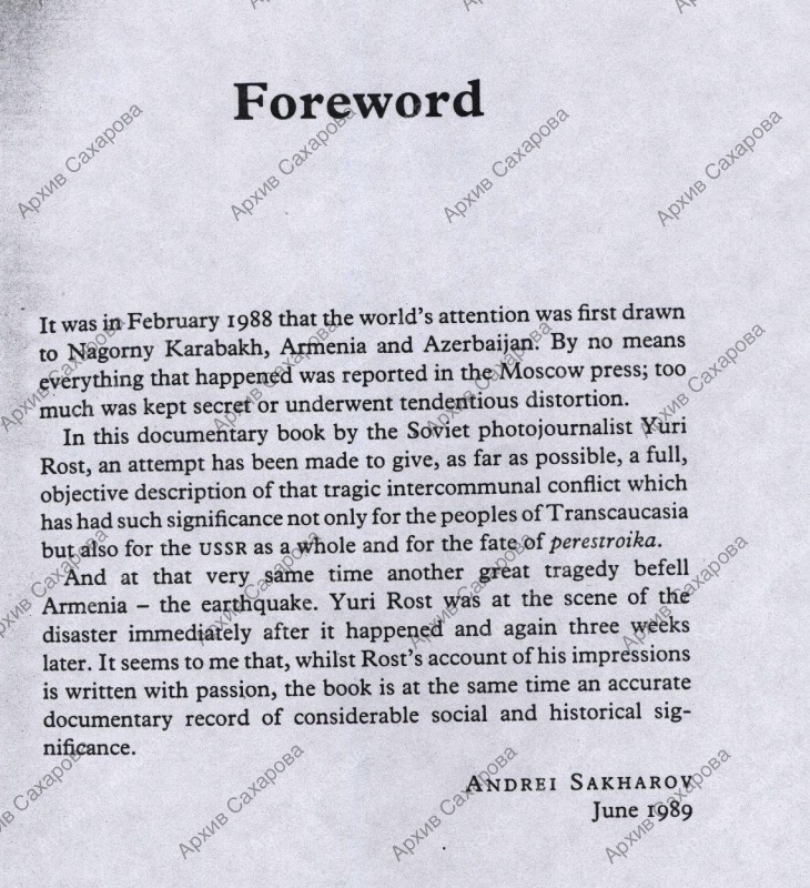 Предисловие А.Д.Сахарова к книге Юрия Роста "Armenian Tragedy"