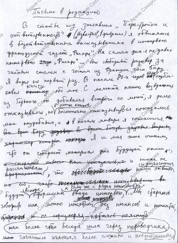 "Письмо в редакцию". Ответ на обвинения, выдвинутые в редакционной статье газеты "Известия" за 1 февраля 1989 г.