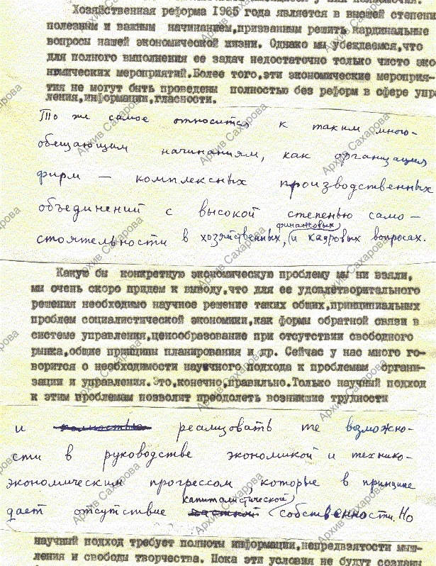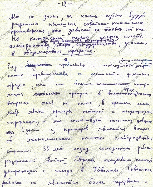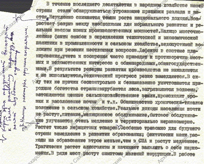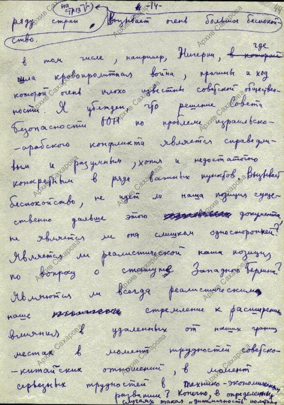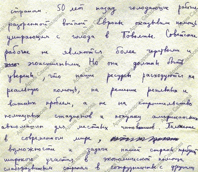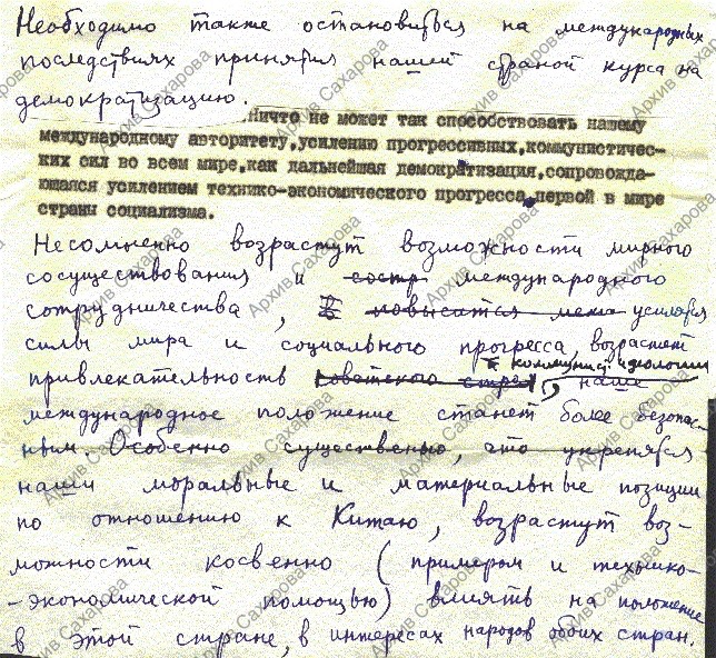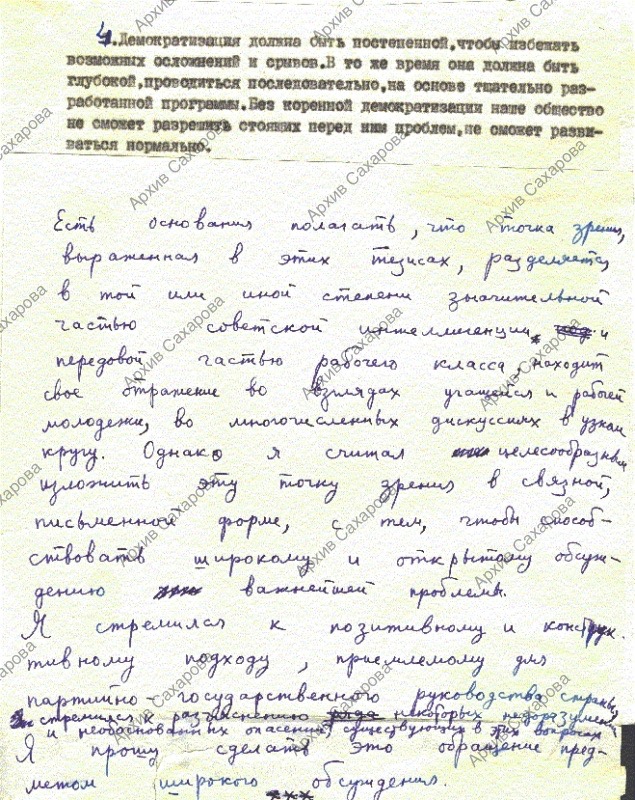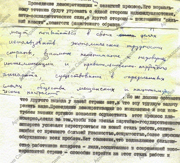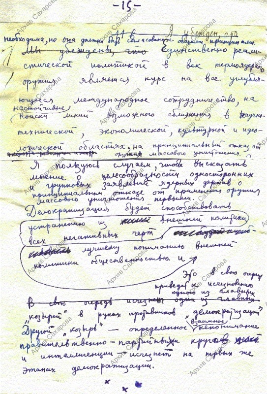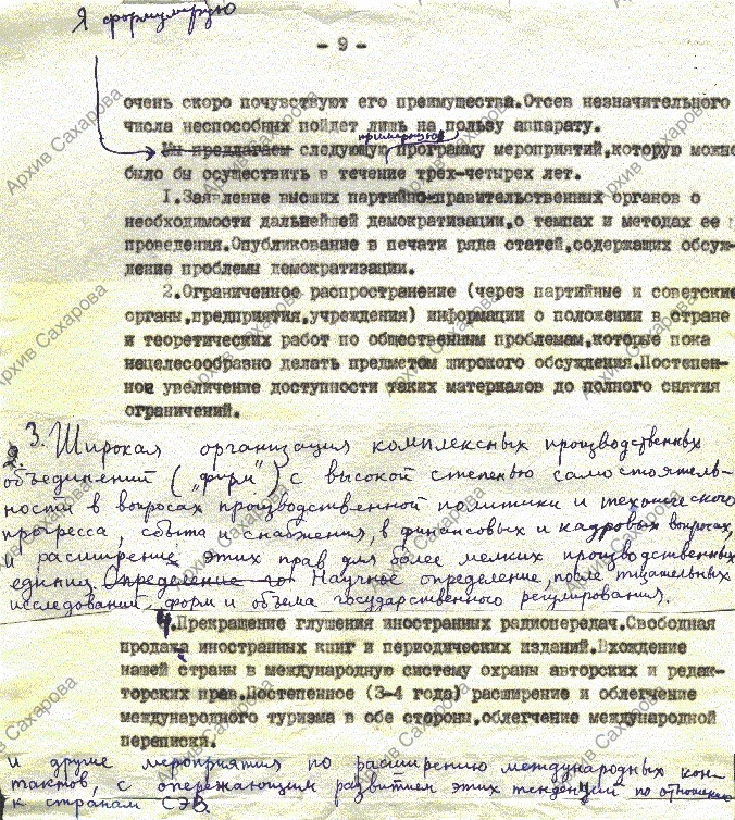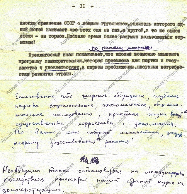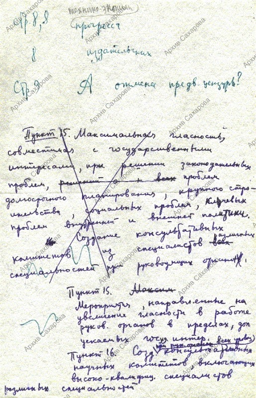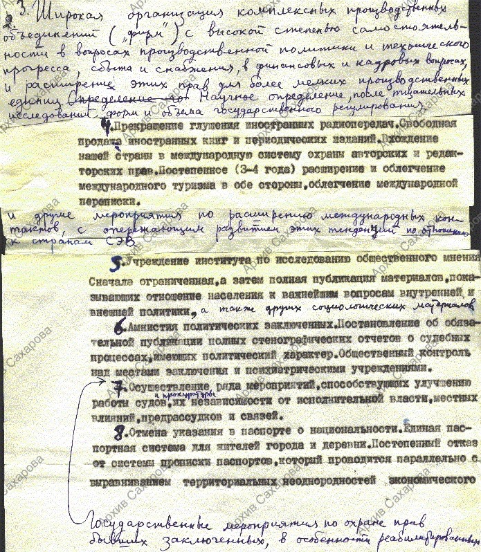 2) на одном из листов - написанные рукой Сахарова п.15 и п.16 плана действий, не вошедшие в вариант, отправленный в ЦК КПСС, но имеющиеся в варианте архива Радио Свободы под п.15