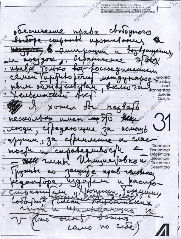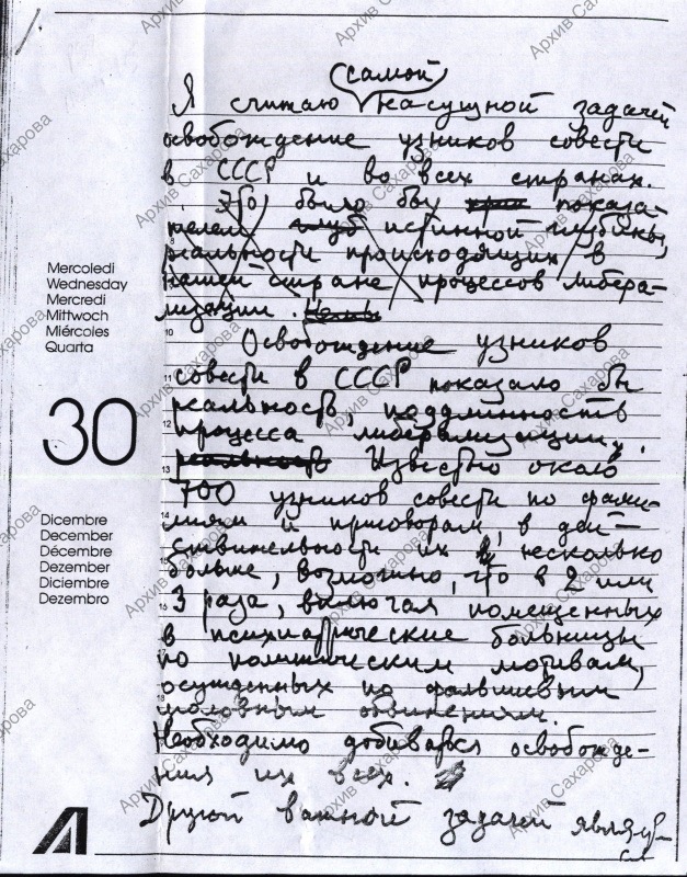 Обращение А.Д.Сахарова к Венскому совещанию по поводу "самой насущной задачи освобождения узников совести в СССР и во всех странах мира"