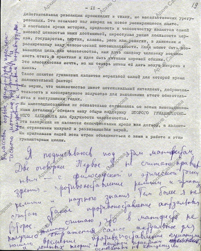 "Две оговорки" к "Гуманистическому манифесту-2", с учетом которых Сахаров его подписал