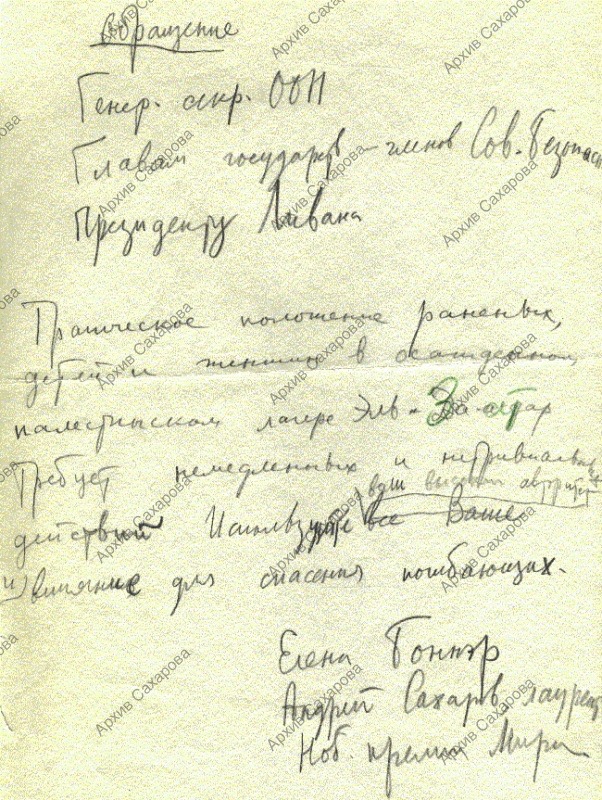 "Обращение" к генеральному секретарю ООН, главам государств - членов Совета Безопасности, президенту Ливана с призывом спасти осажденных в палестинском лагере Эль-Заатар