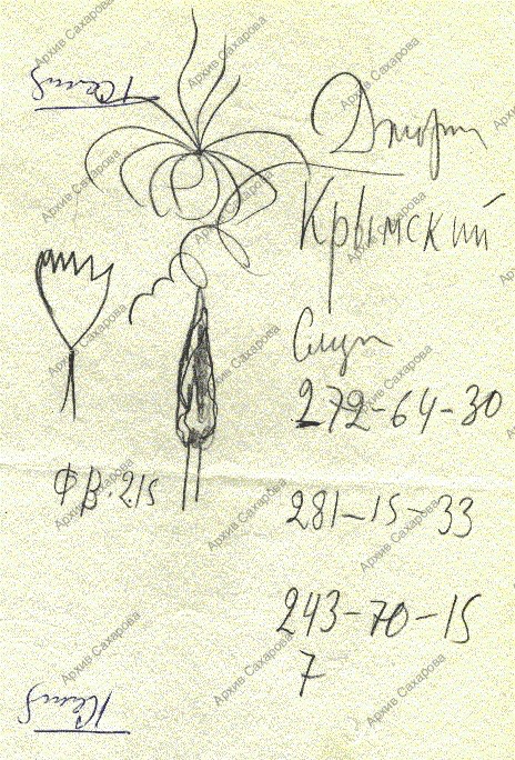 2) на обороте рисунок и номера телефонов, написанные рукой Сахарова