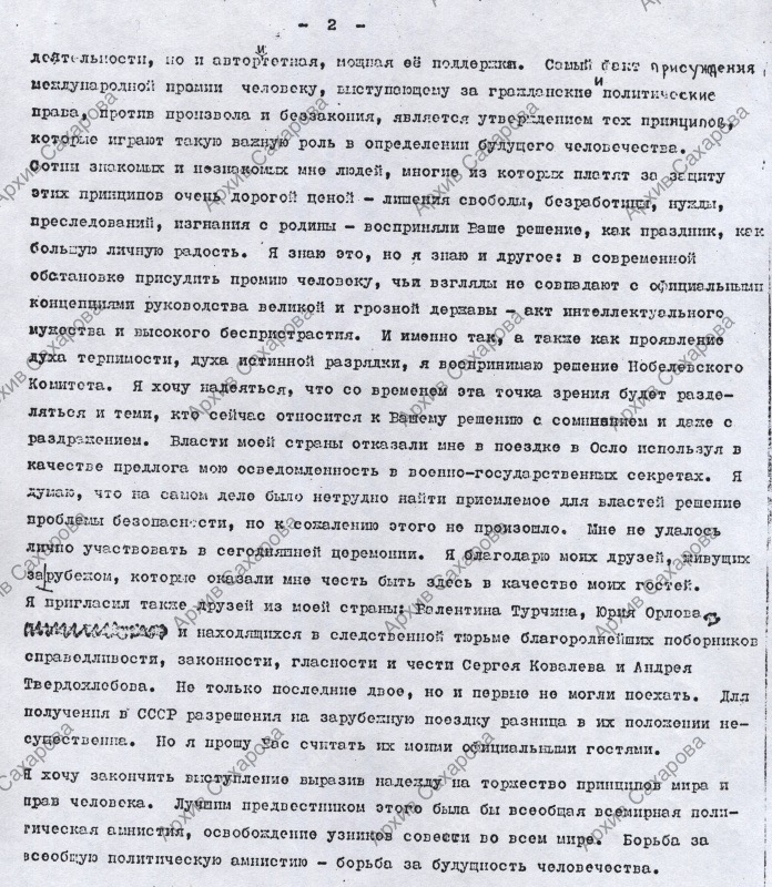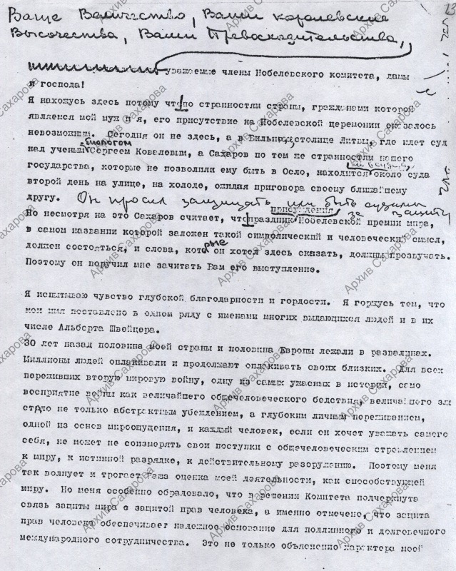 2) на первом листе - вступительное слово Е.Г.Боннэр перед зачтением выступления Сахарова на Нобелевской церемонии